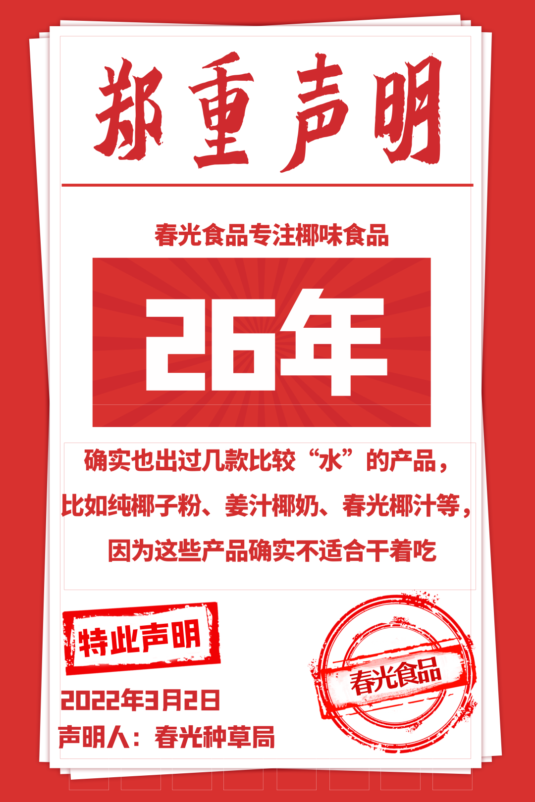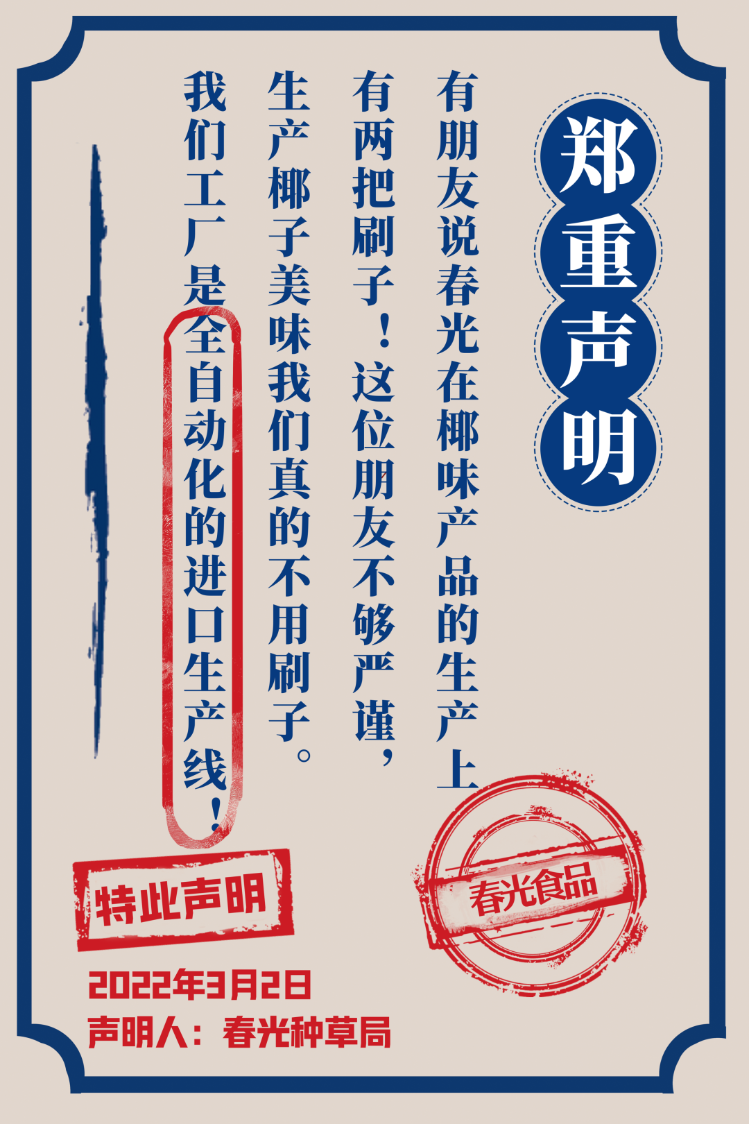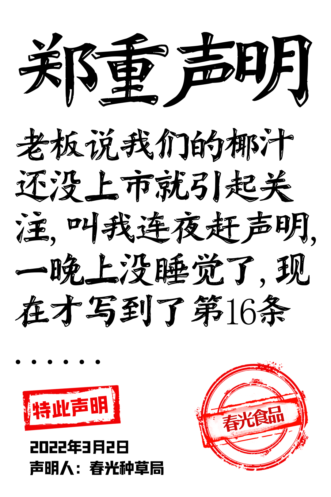 在新品官宣期間,春光食品連發(fā)26條新品聲明,用簡單粗暴又不失趣味性的文案高效傳遞了品牌態(tài)度與產(chǎn)品賣點(diǎn),在大量地圍觀和傳播擴(kuò)散之下,聲明文案成功地吸引了廣大網(wǎng)友的注意力。據(jù)了解,接下來春光食品還將開辦線下品鑒會快閃店、圍繞產(chǎn)品設(shè)計ip卡通等一系列年輕化動作。