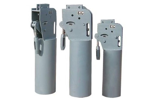 一種用于步進式加熱爐汽化冷卻裝置中步進機構所使用的恒力彈簧吊架,特征是恒力彈簧組由一組受拉彈簧、一組受壓彈簧和彈簧支架組成,滾珠軸承機構由滾珠軸承,中心軸,防塵罩和U型拉桿組成,吊板上部與上聯(lián)箱進行焊接,吊板下部安裝有滾珠軸承機構,滾珠軸承機構通過調整螺絲、拉桿與恒力彈簧組上端連接,恒力彈簧組下端通過拉桿、調整螺絲與固定在管道上的管部吊耳連接。